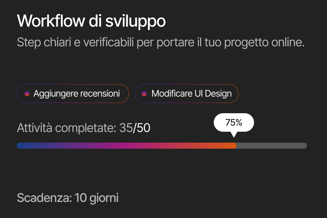 Consegniamo in 7-30 giorni grazie al nostro metodo a fasi ottimizzato. PERÒ: richiediamo collaborazione attiva - se rispetti i tempi di feedback concordati, manteniamo la velocità promessa.